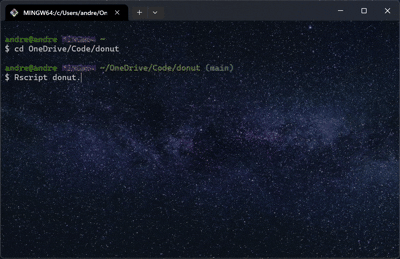 After downloading the code from GitHub, the donut can only be rendered by opening a terminal and requires Rscript to be a PATH variableAt least on Windows 11. On other operating systems, make sure that can be called from the terminal by running: Rscript --version.. Below is a short animation of the script running on my computer.